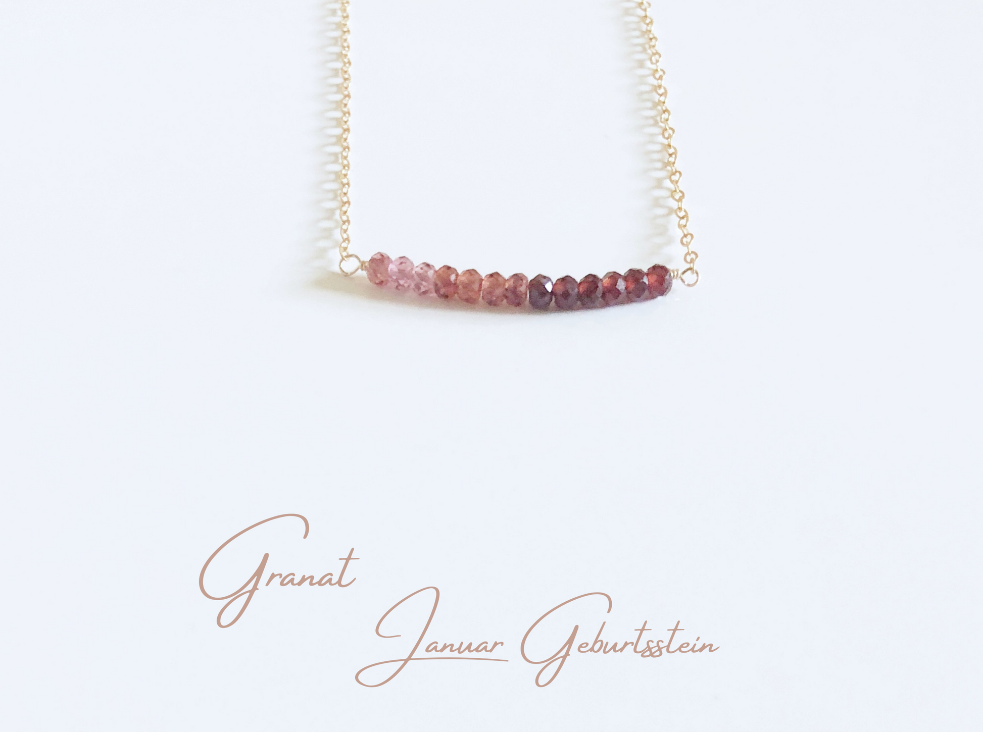 Hier haben wir eine filigrane Granat Halskette mit Farbverlauf für Dich.