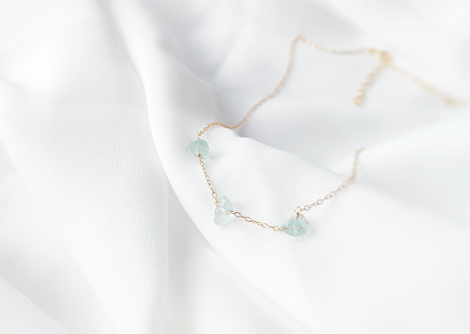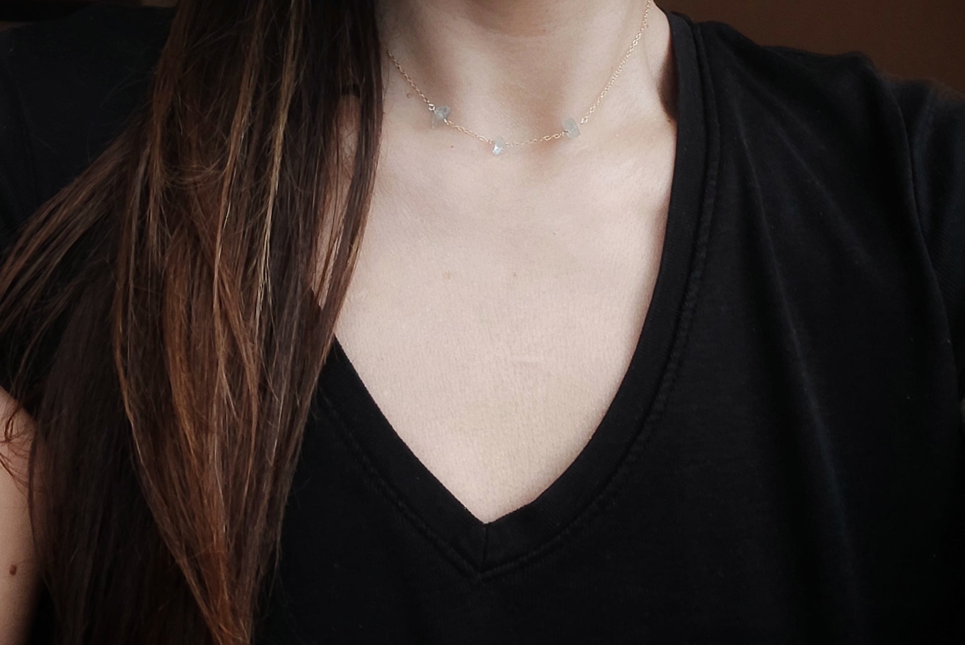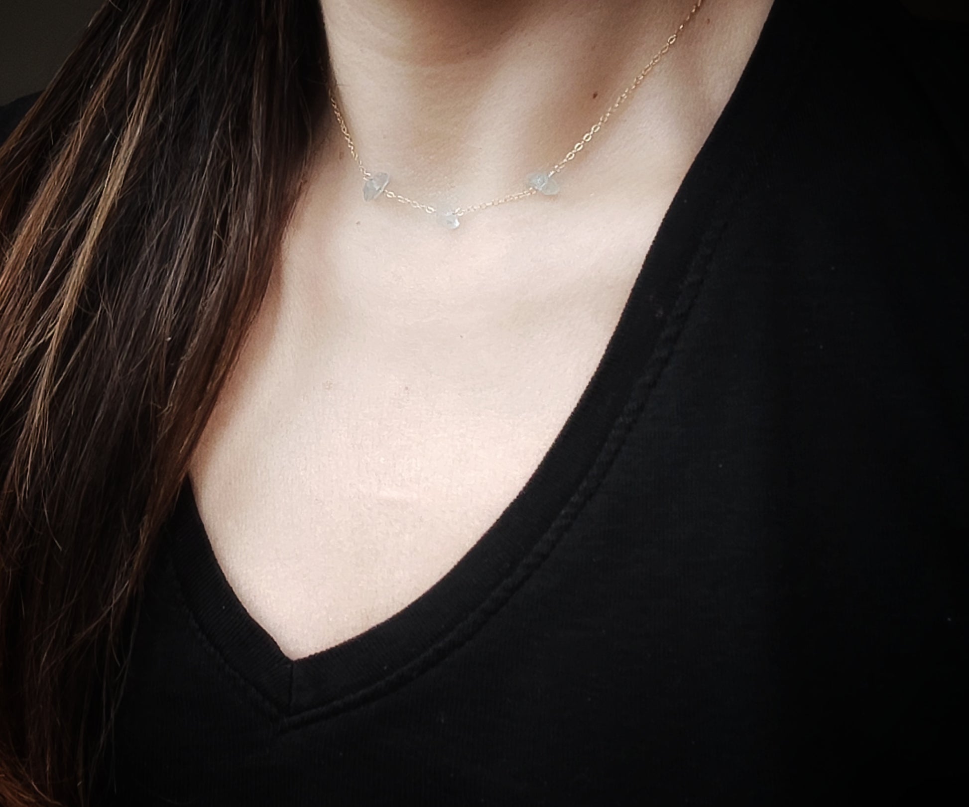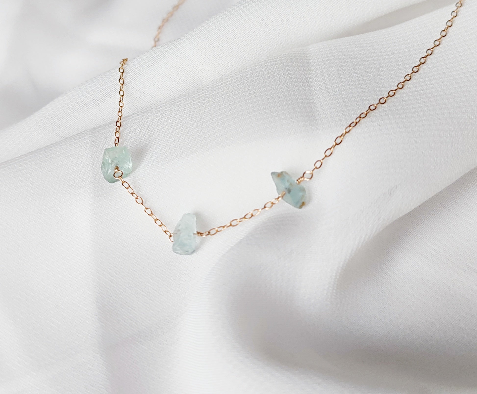 Hier haben wir eine minimalistische Rohsteinkette mit drei kleinen Aquamarin Rohsteinen für dich.