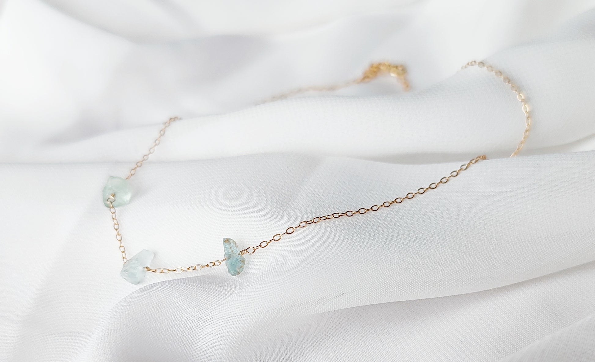 Zierliche Aquamarin Rohsteinkette, März Geburtsstein Halskette mit Aquamarin Rohsteinen