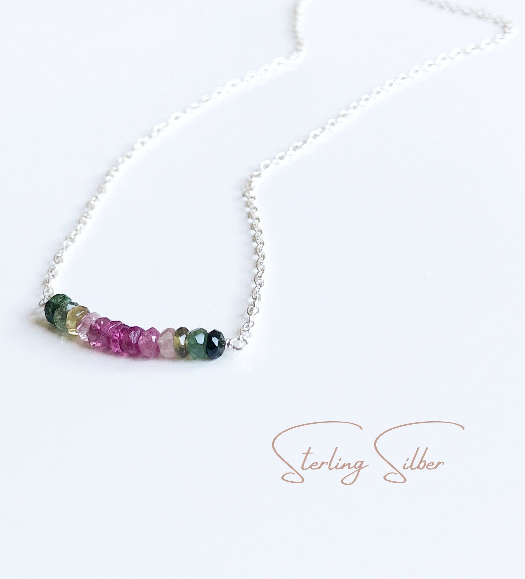 Zarte Halskette mit unbehandelten Turmalin Steinchen. Die kleinen Turmalin Steine haben wir mit einem Farbverlauf von grün bis rosa für Dich angeordnet. Die Halskette kann sowohl für sich als auch mit anderen Ketten zusammen getragen werden und sieht dadurch immer wieder toll aus. Der Turmalin ist traditionell der Geburtsstein für alle die im Oktober Geburtstag haben aber ihm werden (besonders in dieser Farbzusammenstellung) auch zahlreiche heilende und schützende Wirkungen nachgesat. Die feine Kette ist in 925 Sterling Silber, Gold filled und Roségold filled erhältlich. Gerne bauen wir Dir auch eine Kette nach Deinen wünschen an. Wir freuen uns auf Deine Nachricht. Die Halskette kommt in unserer Schmuckschachtel zu Dir.