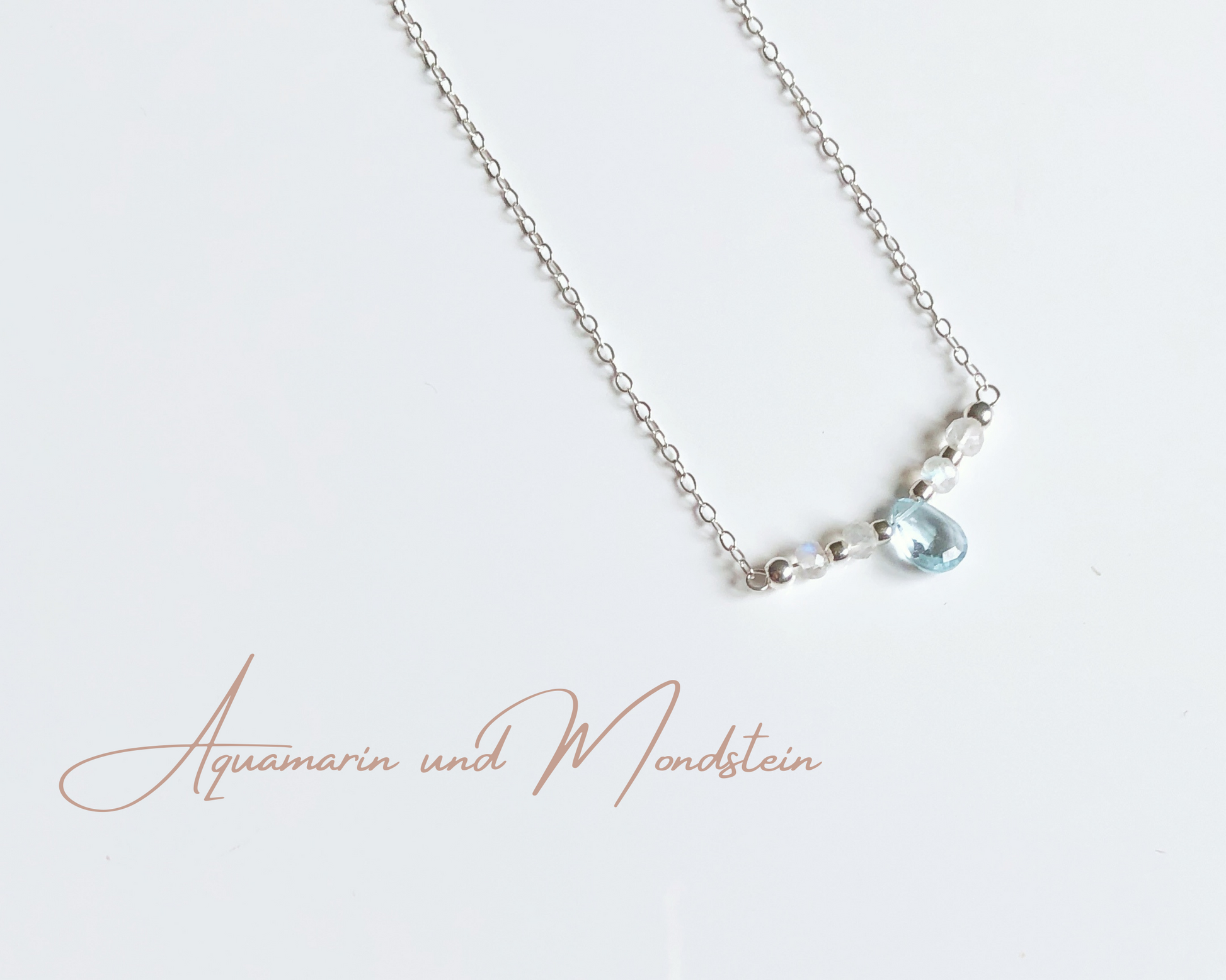 Zarte Aquamarin Kette mit Mondstein, Filigrane Goldkette mit Aquamarin Tropfen, Minimalistischer Schmuck für Frauen