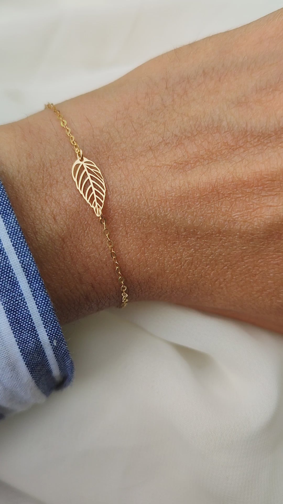 Hier haben wir ein filigranes Armband mit einem 15mm kleinem Blatt. Das zarte Armband ist aus vergoldetem 925 Sterling Silber und wurde in Handarbeit von uns angefertigt.