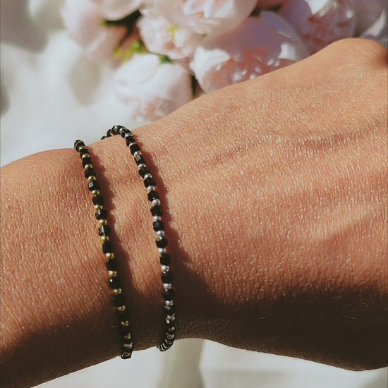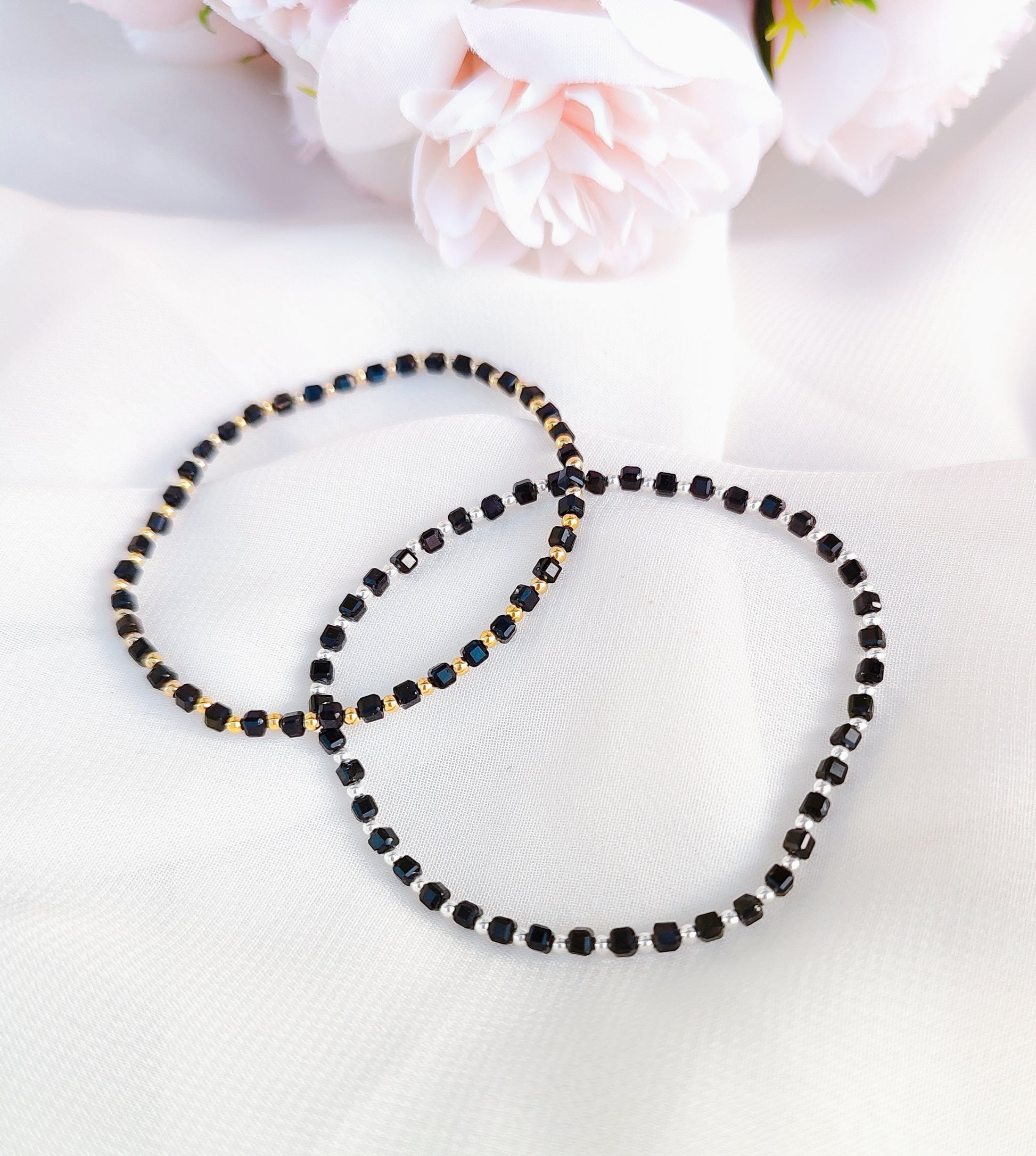 Elastische Armbänder mit schwarzen Turmalin Würfeln, Oktober Geburtsstein Armband