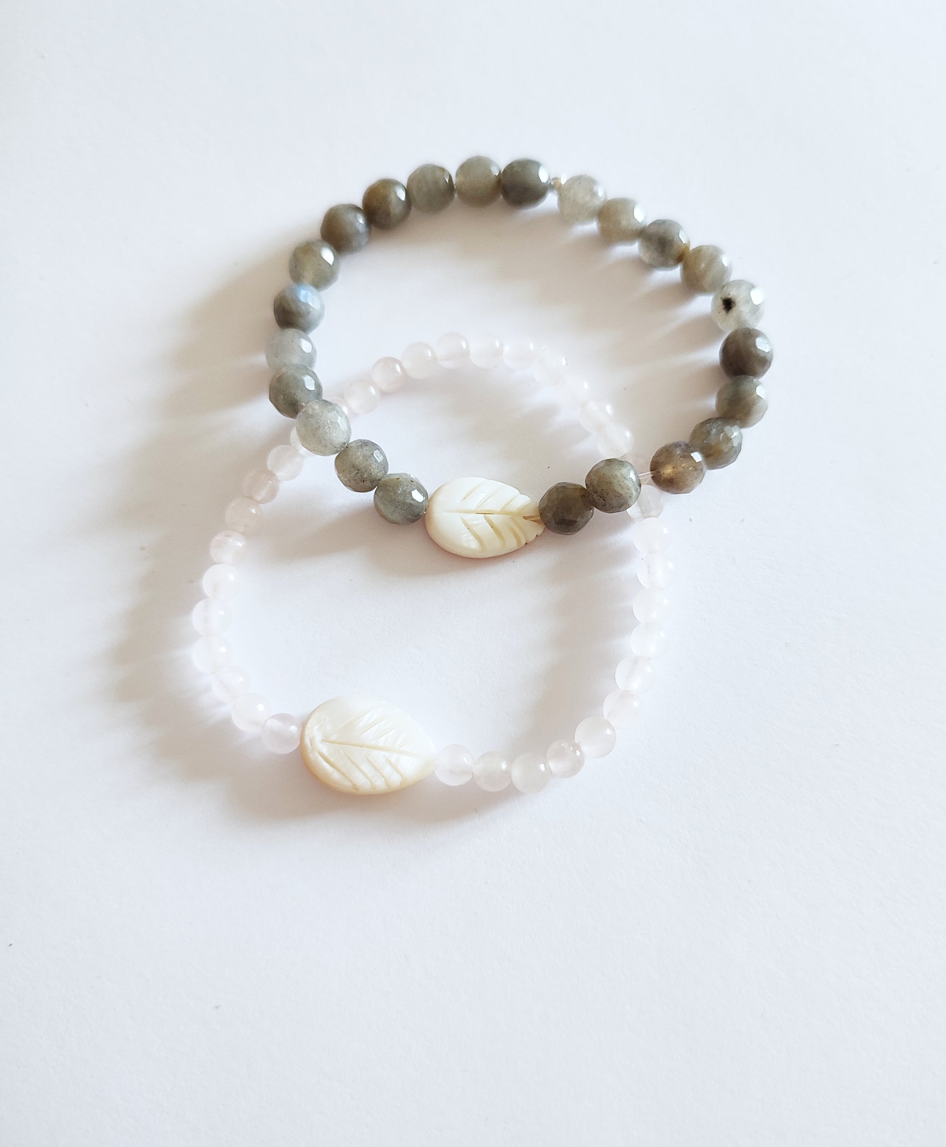 Elastisches Armband mit 4,5mm Perlen aus Labradorit oder Rosenquarz Perlen und Perlmutt Blatt.