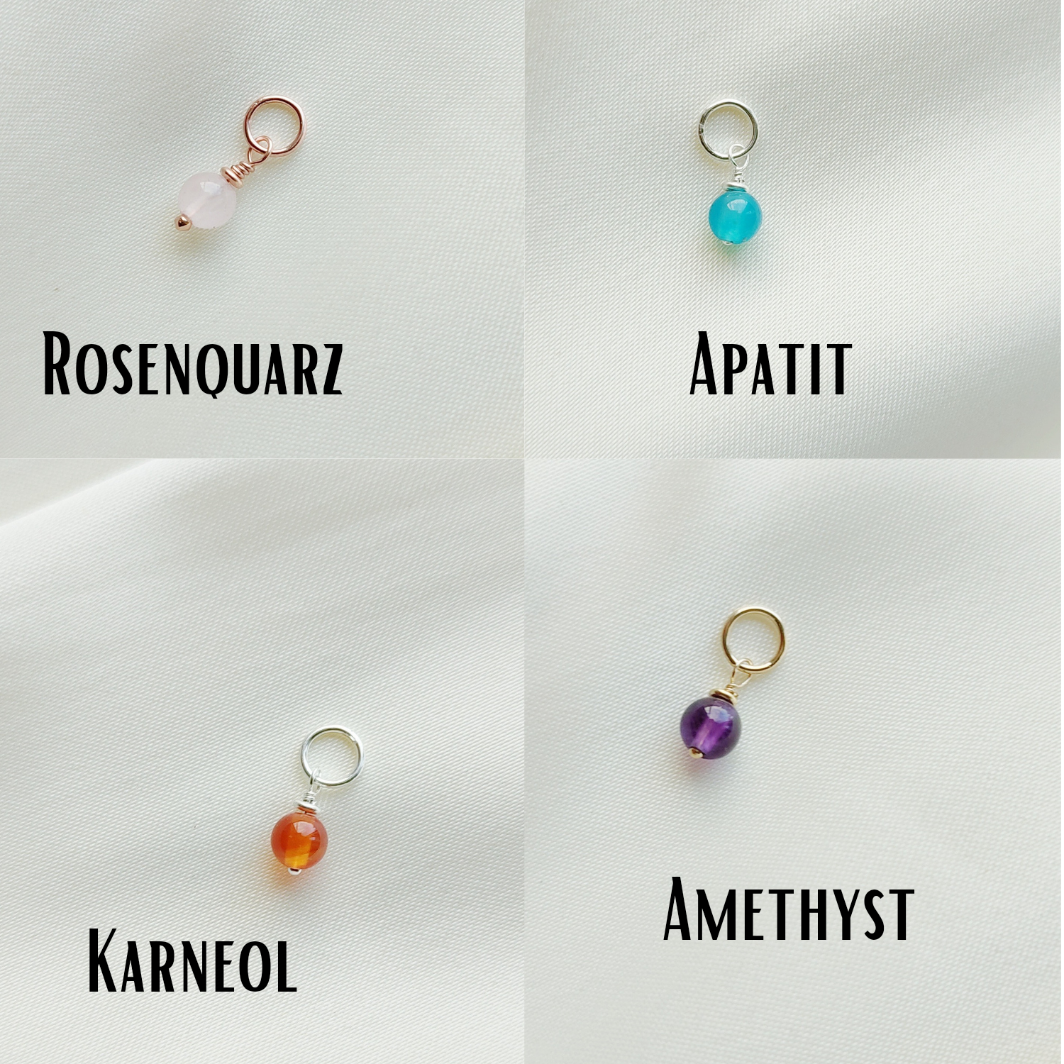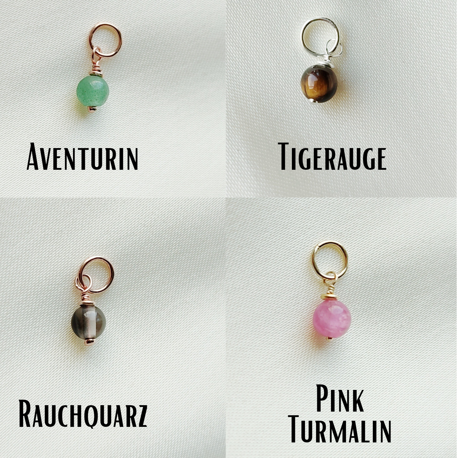 Die süßen kleinen Anhänger sind aus 925 Sterling Silber, Gold Filled oder Roségold Filled. Die Anhängeröse hat eine Größe von 5 mm und passt über die meisten Halsketten-Ösen, Armbänder oder auch an Creolen. Die Steine die wir hier anbieten sind alle echt und unbehandelte. Die Steine haben eine Größe von 4mm. Nach Absprache sind auch andere Steinarten und andere Größen erhältlich.