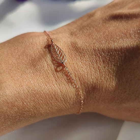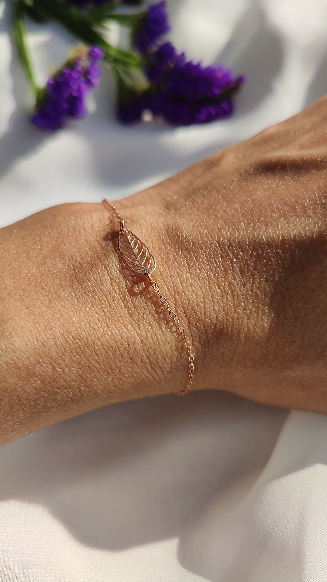 Hier haben wir ein filigranes Armband mit einem 15mm kleinen Blatt. Das zarte Armband ist aus vergoldetem 925 Sterling Silber und wurde in Handarbeit von uns angefertigt.