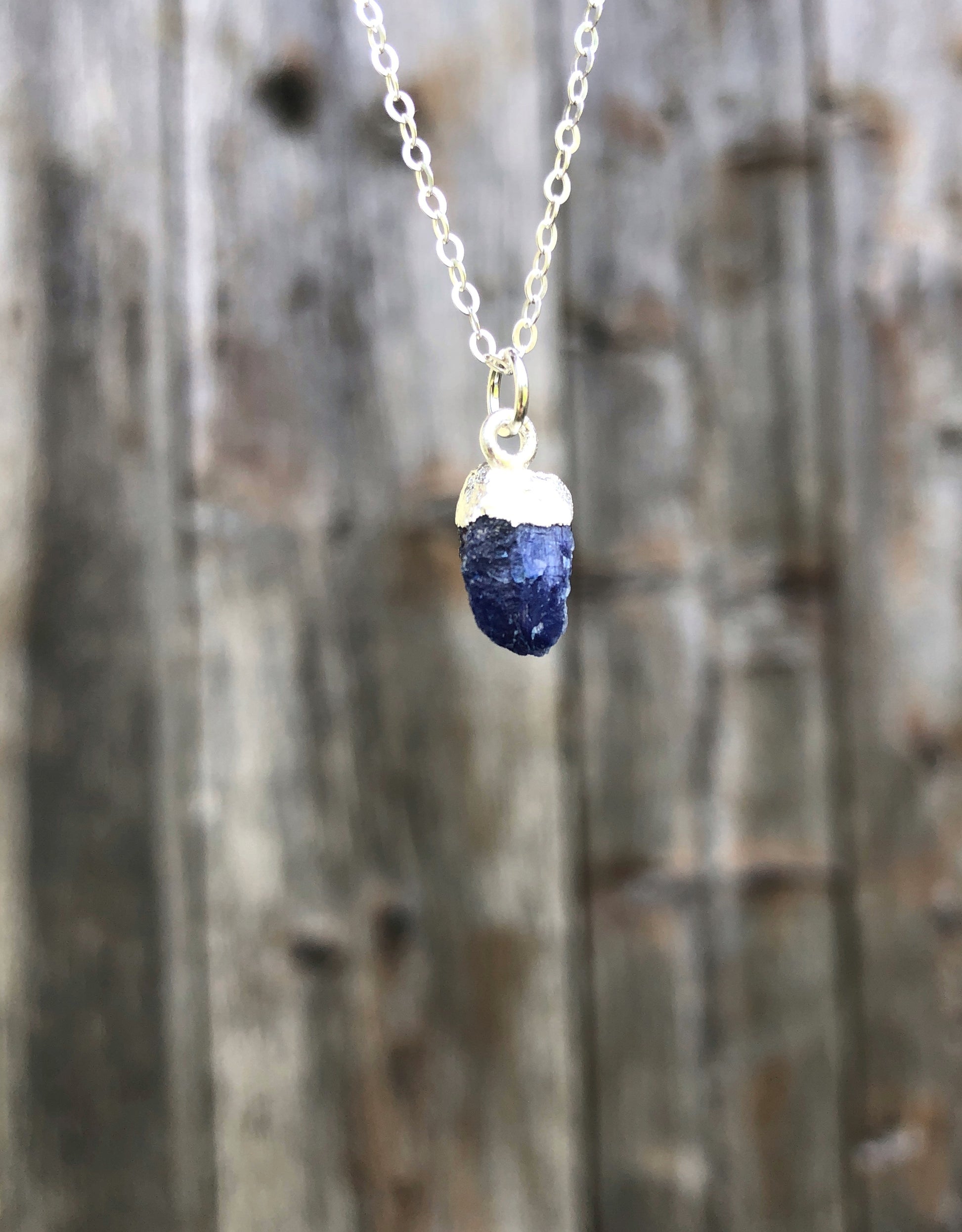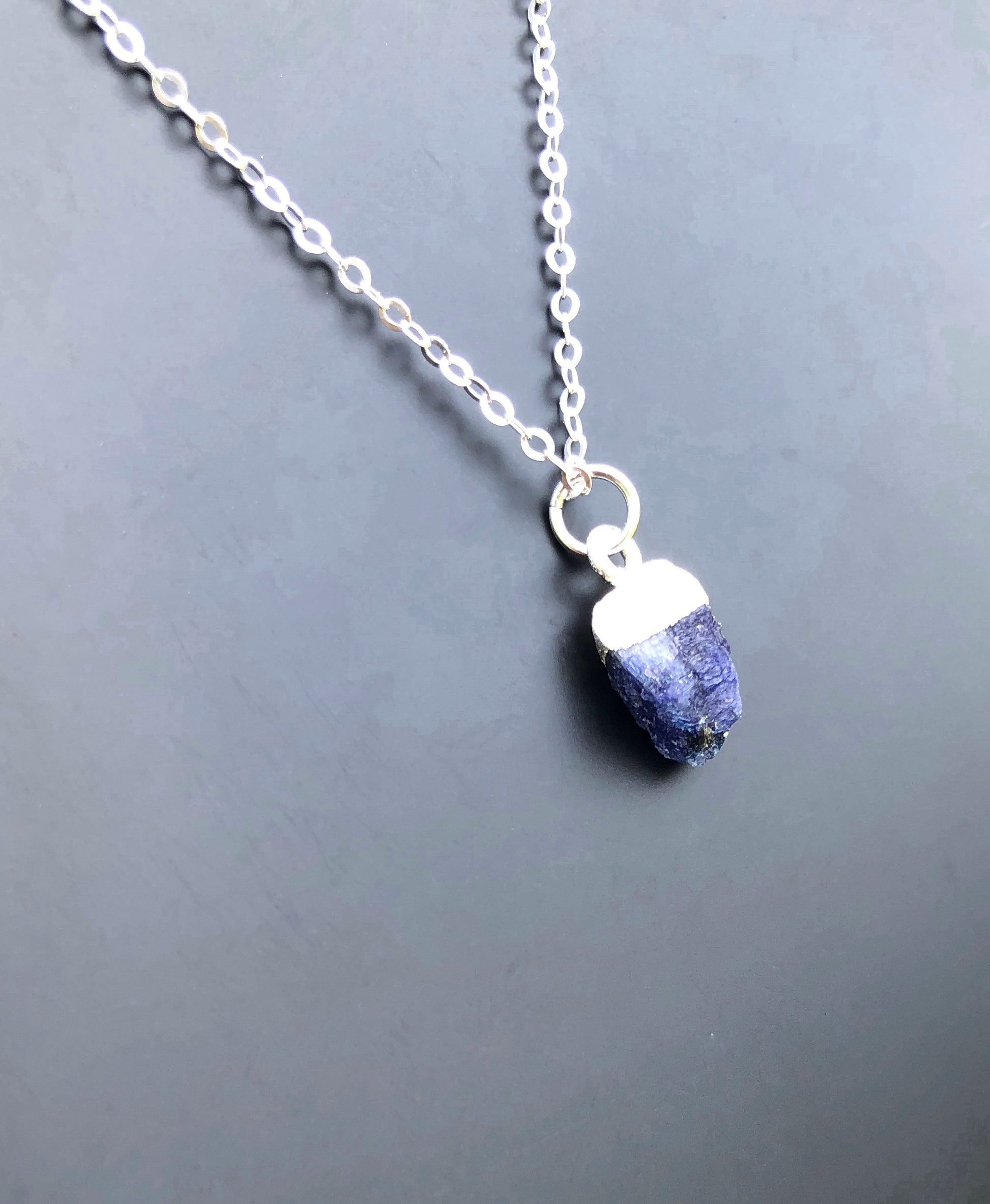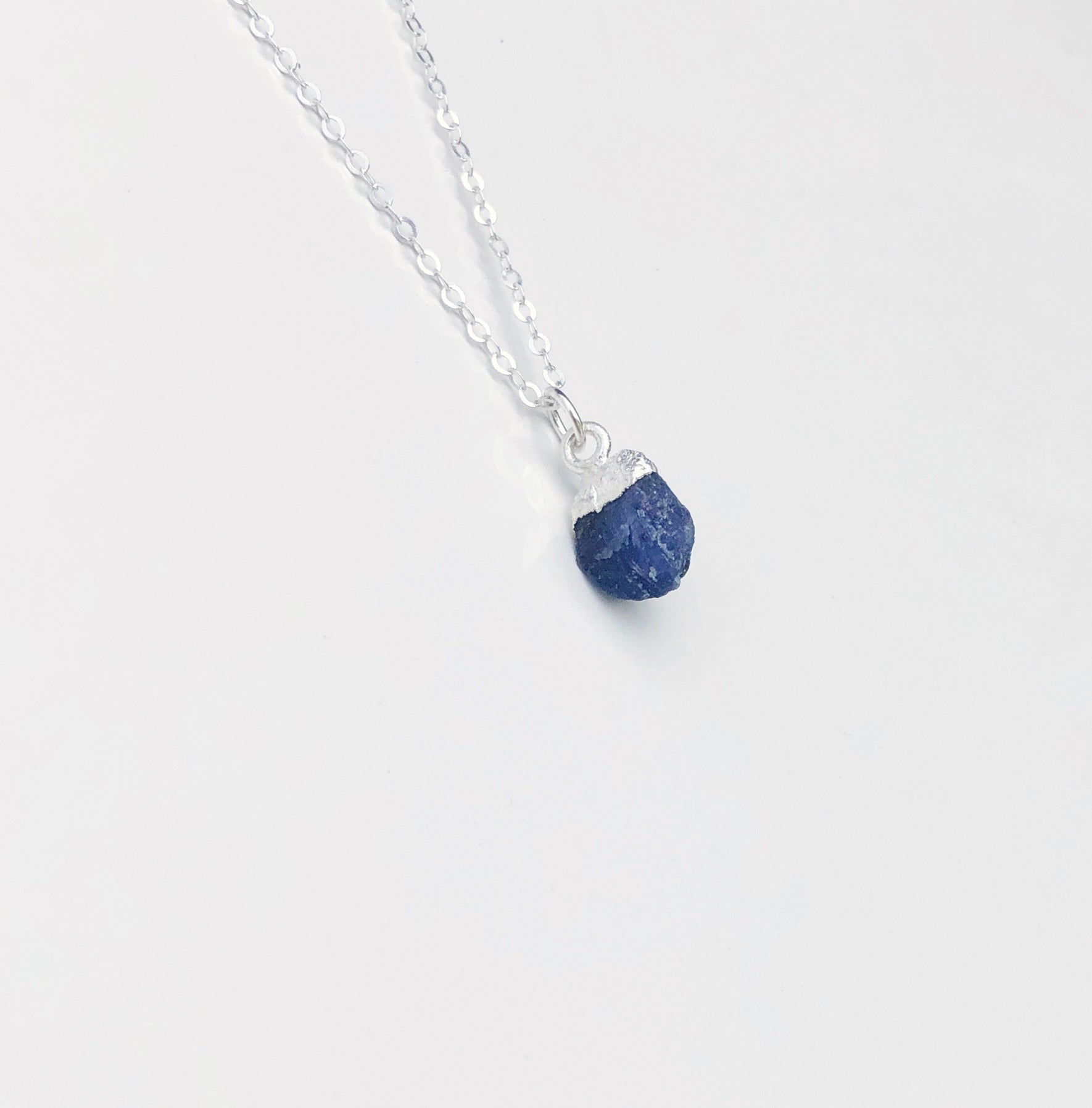 Hier haben wir einen kleinen Anhänger mit einem blauen Saphir Rohstein in einer Fassung aus 925 Sterling Silber.