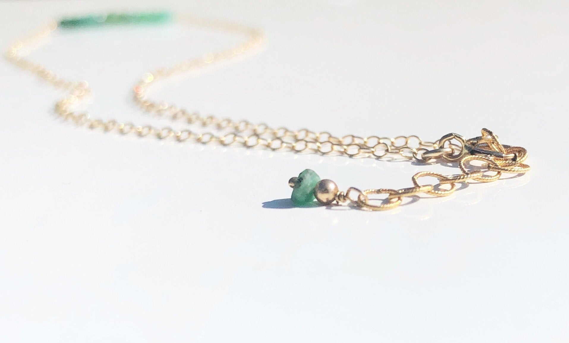 Hier haben wir eine filigrane Smaragdkette mit Farbverlauf für Dich. Die Farbpalette der echten Smaragde reicht von fast pastellgrün bis hin zu einem tiefen waldgrün. Die Steine wurden selbstverständlich nicht gefärbt oder hitzebehandelt. Am Verschluss haben wir eine Verlängerungskette angebracht damit Du die Kette je nach Outfit in der Länge variieren kannst. Der Smaragd ist traditionell der Geburtsstein für alle die im Mai Geburtstag haben.