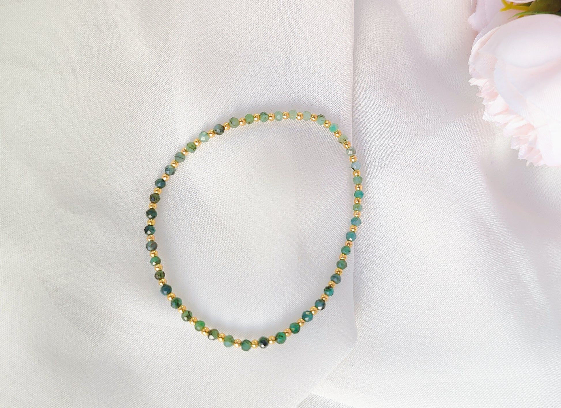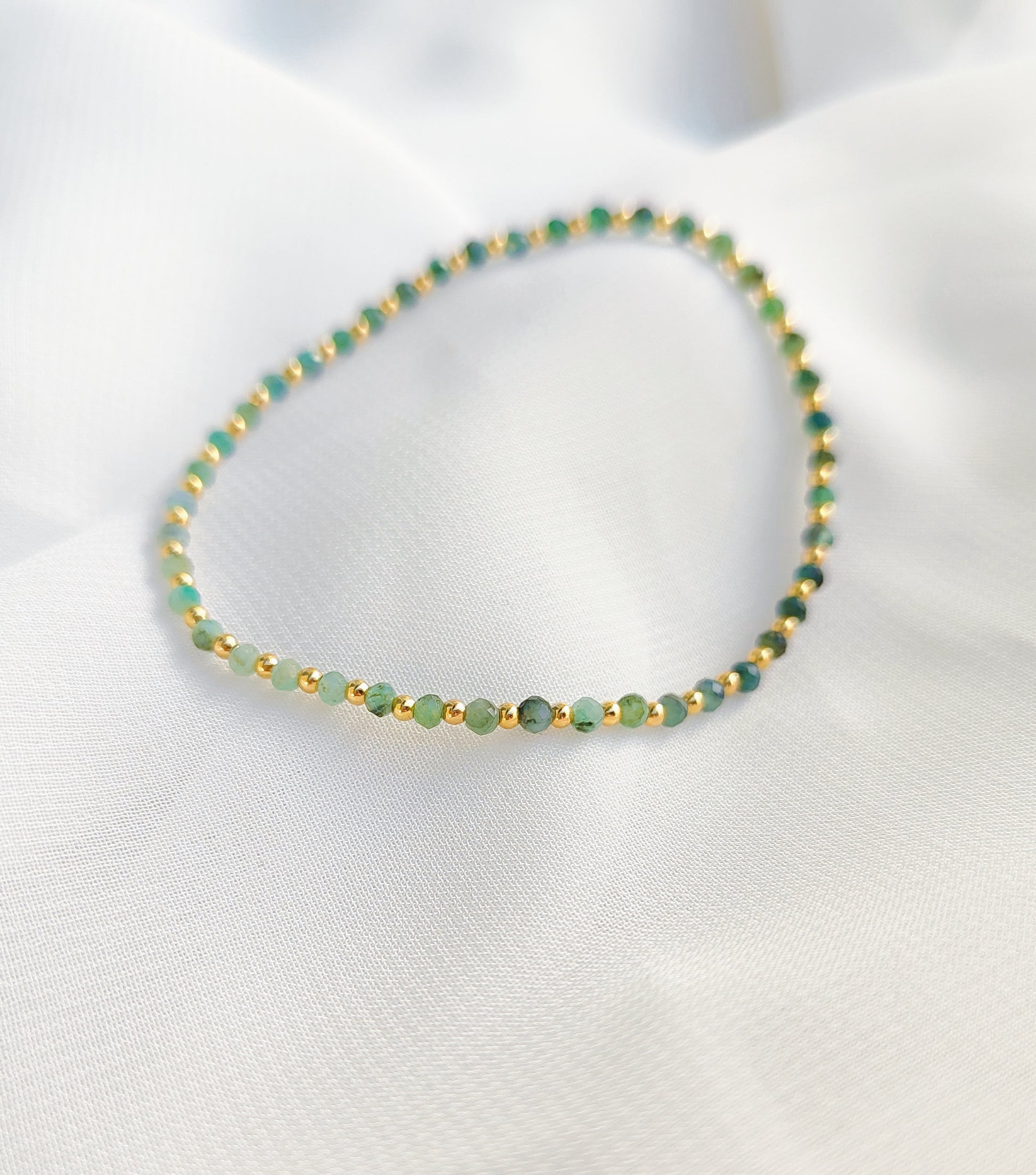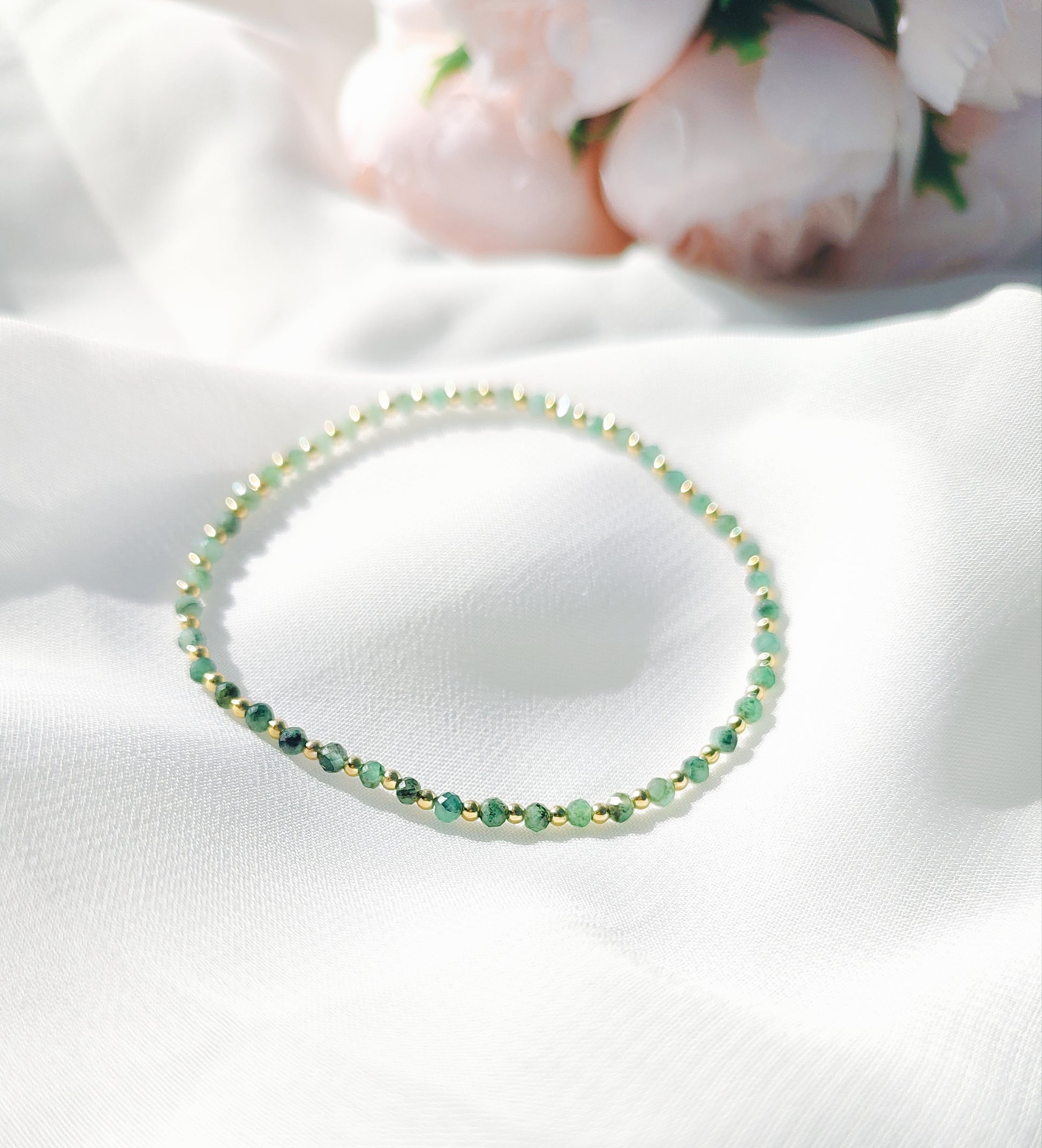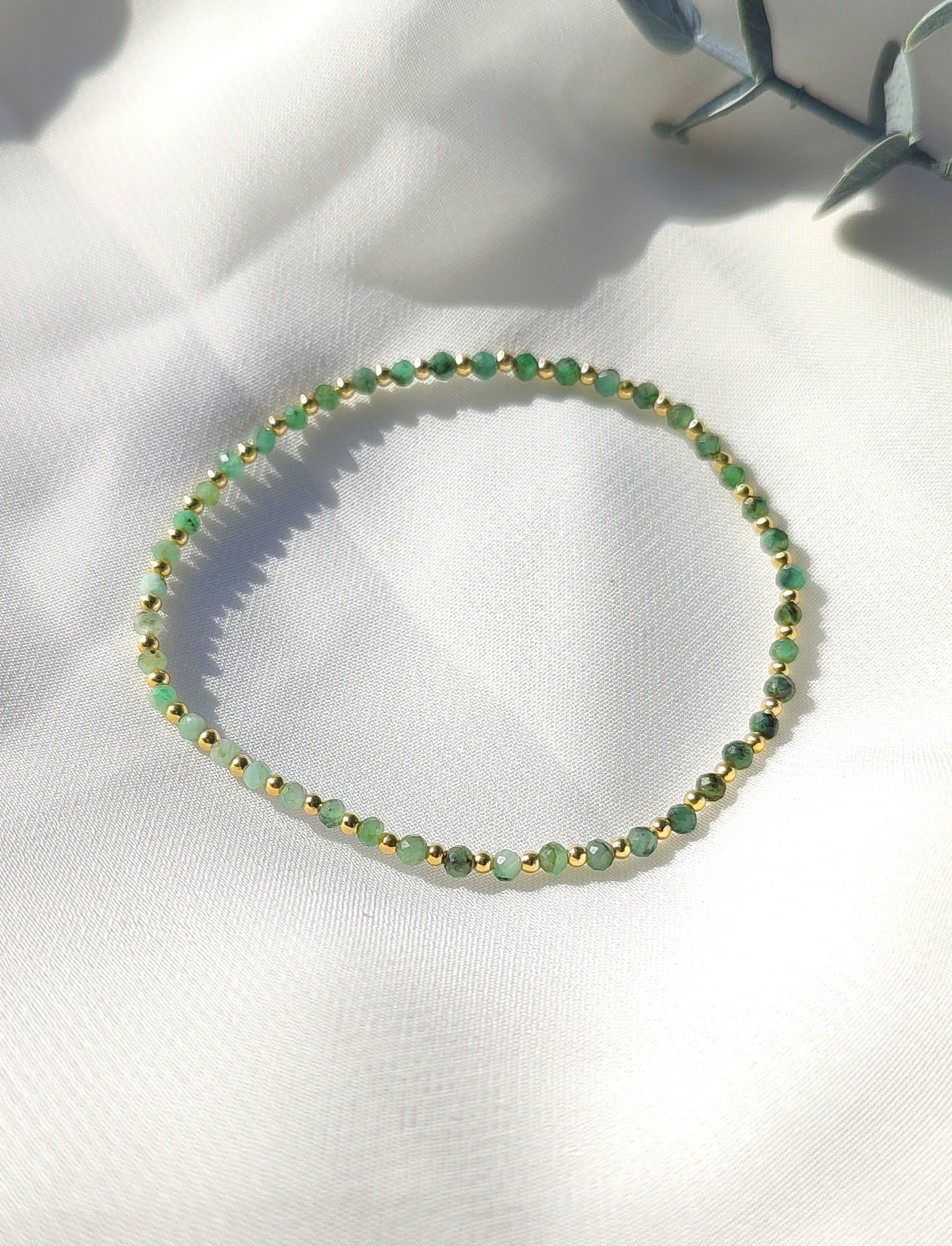Die Smaragd Steinchen sind unbehandelt und werden dem Geburtsmonat Mai zugeordnet. Das Armband hat einen zarten Farbverlauf und kann sowohl mit anderen Armbändern, als auch alleine für sich getragen werden. Das elastische Armband ist bequem zu tragen und auch im turbulenten Zeiten robust genug um mit dir mitzuhalten.