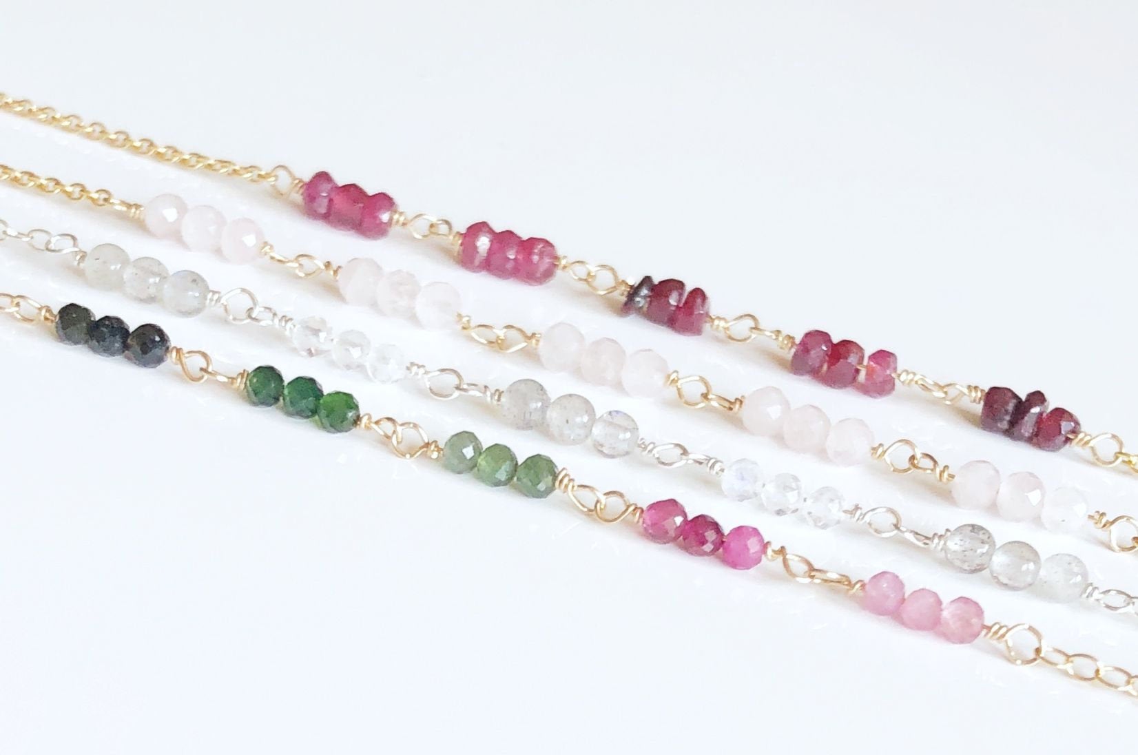 Zartes Armband mit Farbverlauf, Turmalin Armkettchen, Rubin, Rosenquarz, Labradorit, Mondstein