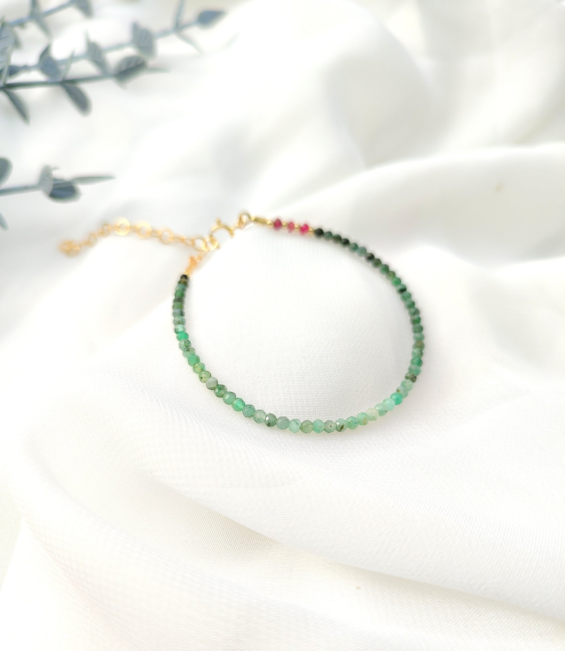 Zartes Smaragd Armband mit Rubin Perlen, Mai Juli Geburtsstein Schmuck, Smaragd mit Farbverlauf, Dünnes Stapel Armband